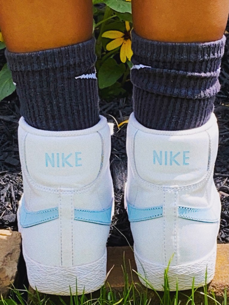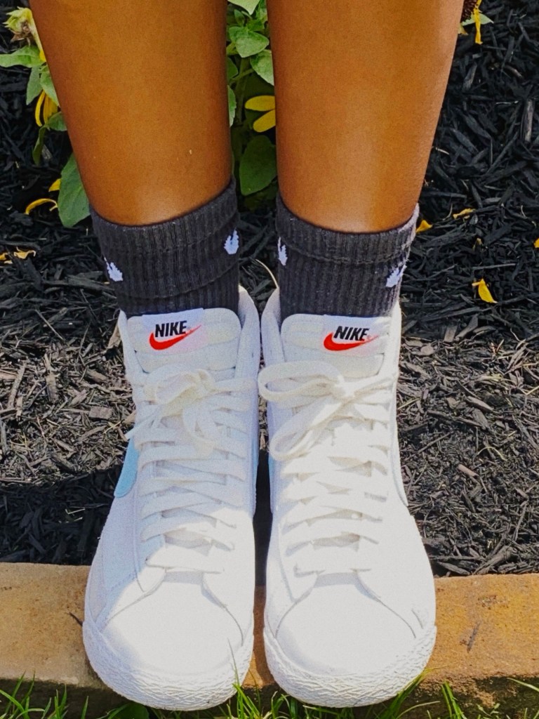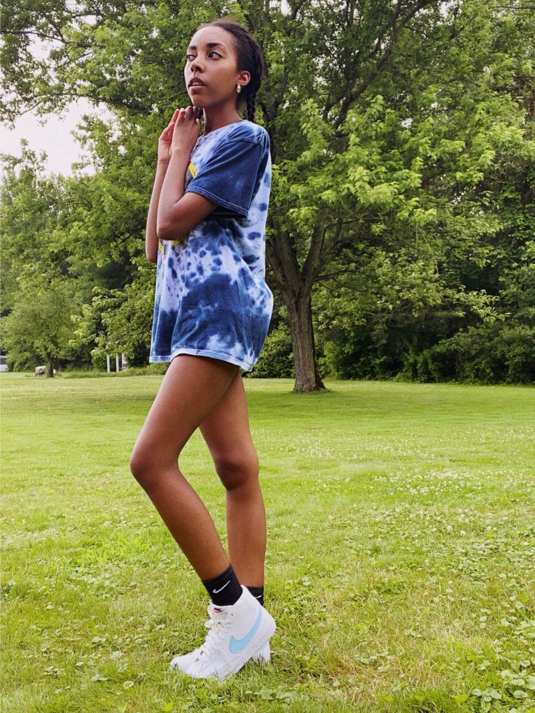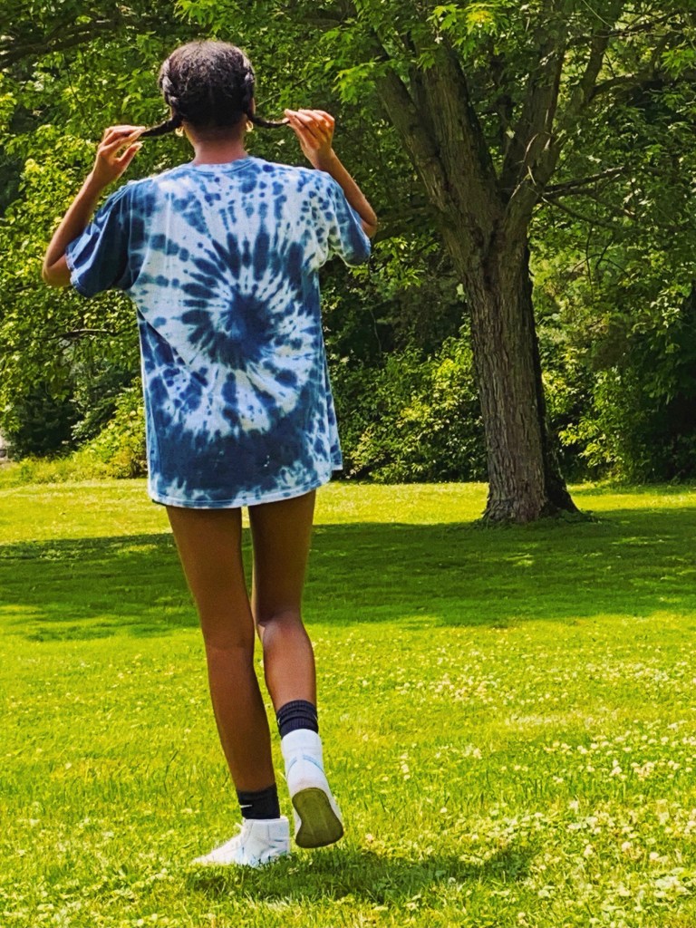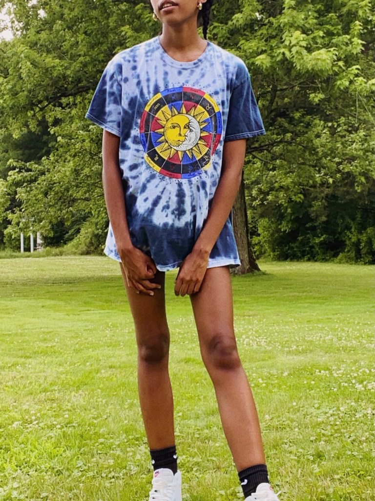 A graphic tee that is too big for me on top of denim shorts and sneakers.
