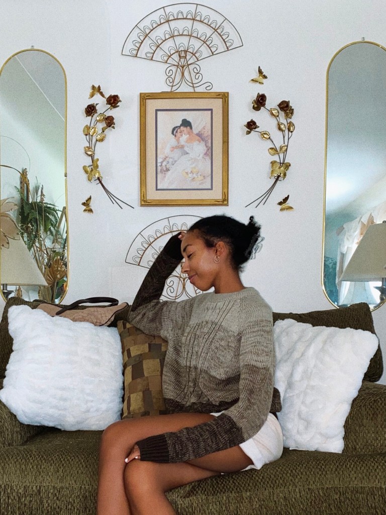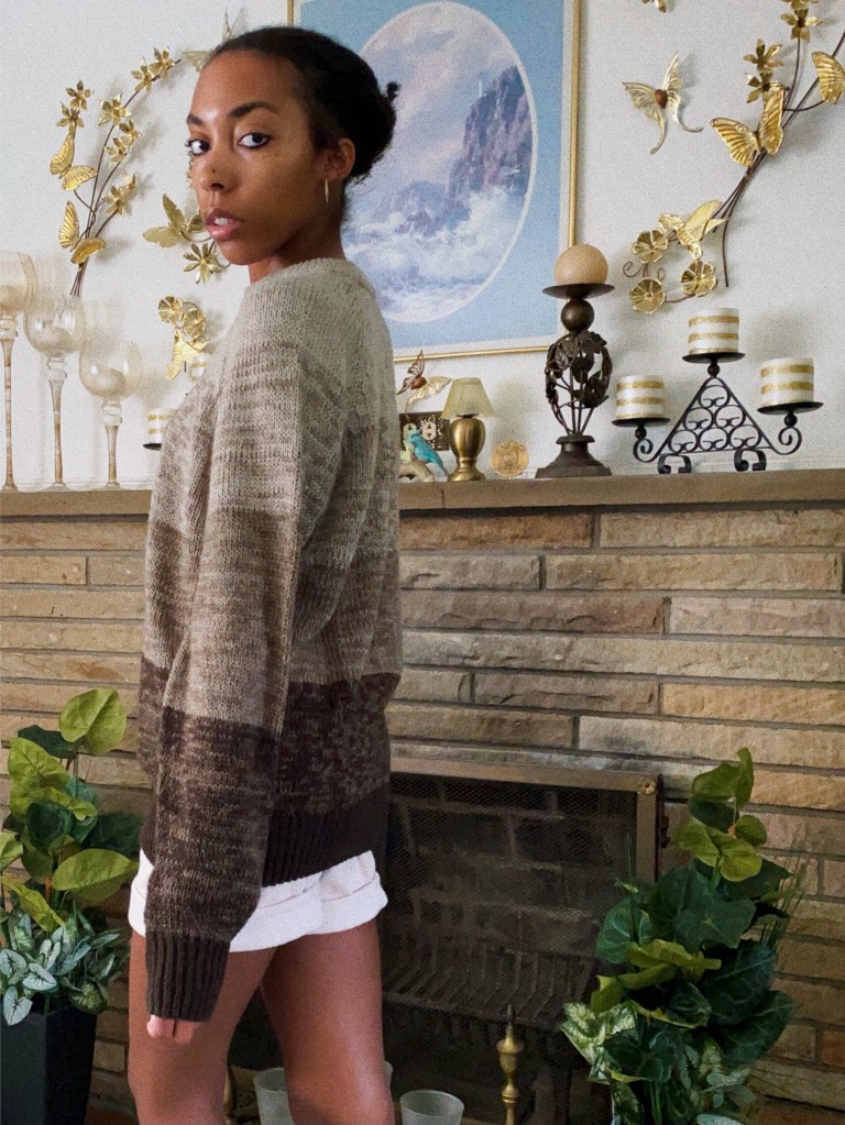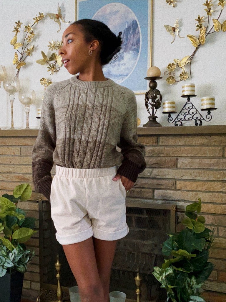 1. Pick a comfortable sweater and shorts. Once again, I picked cotton shorts. I love this thick knitted sweater, and I like this look as an oversized option.