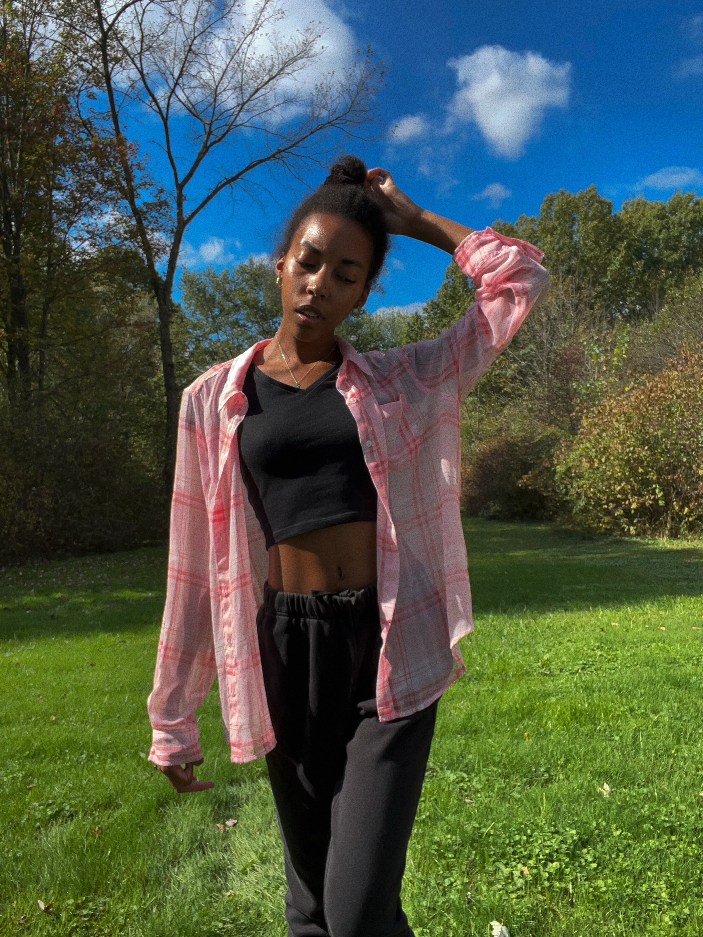 Details: flannel, short sleeve crop top, sweats | This is fitting for a night out downtown perhaps for food, drinks, and music.