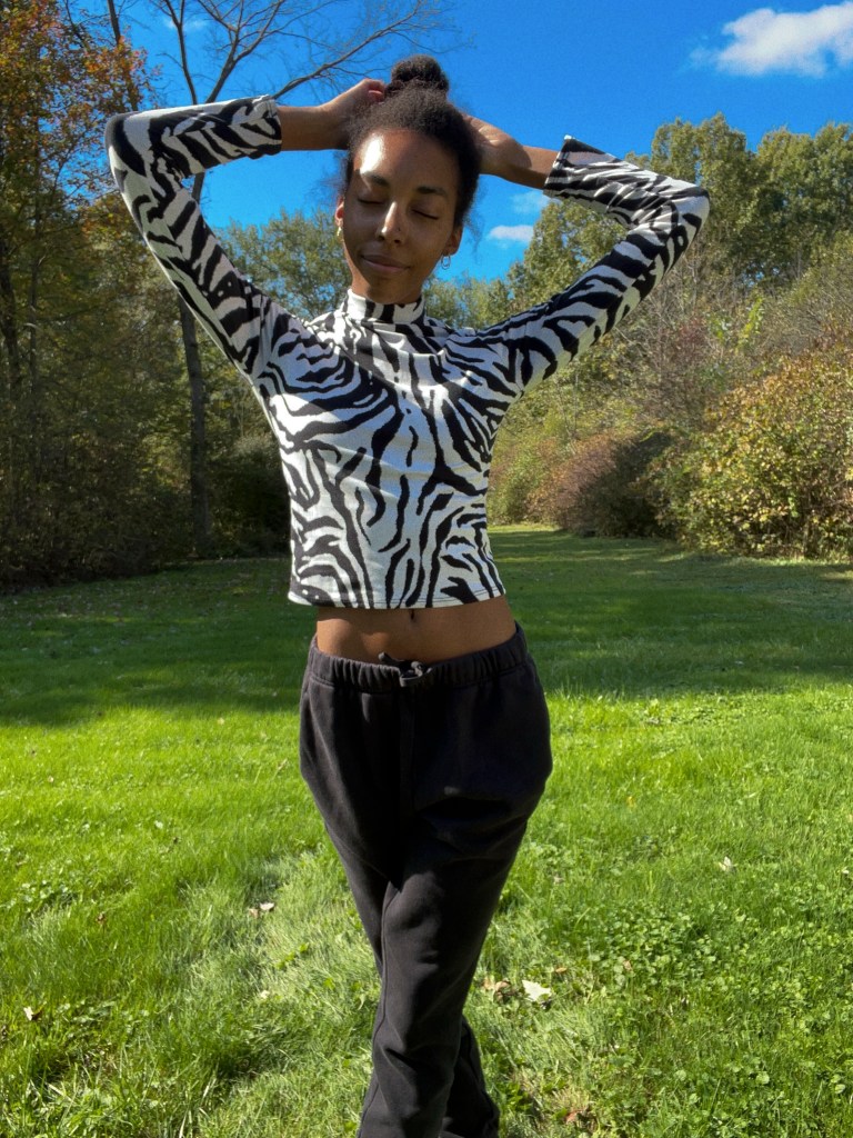 Details: long sleeve crop top, sweats | I often wear something like this when I’m out shopping or looking around. It’s an easy and comfortable way to make a statement.