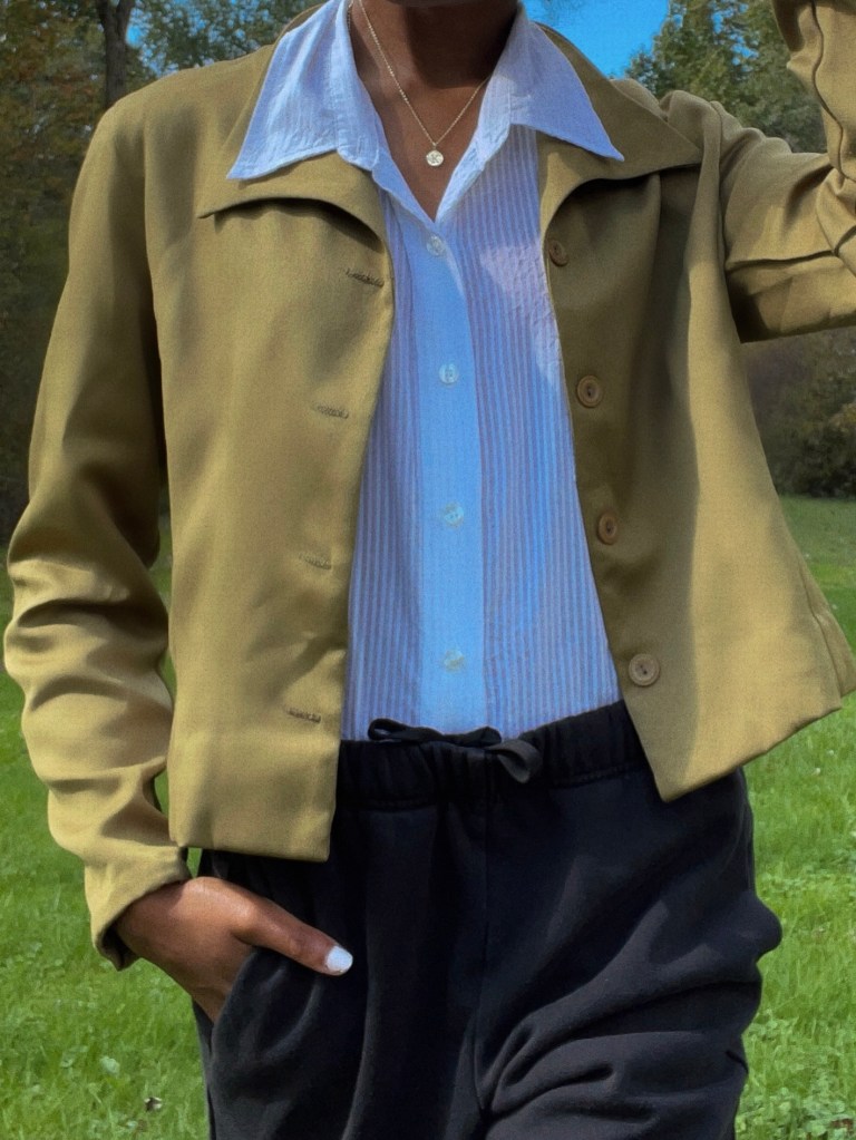 Details: casual blazer, white button-down, sweats | This style very much gives me “heading to the subway to run errands in NYC.”