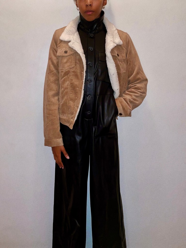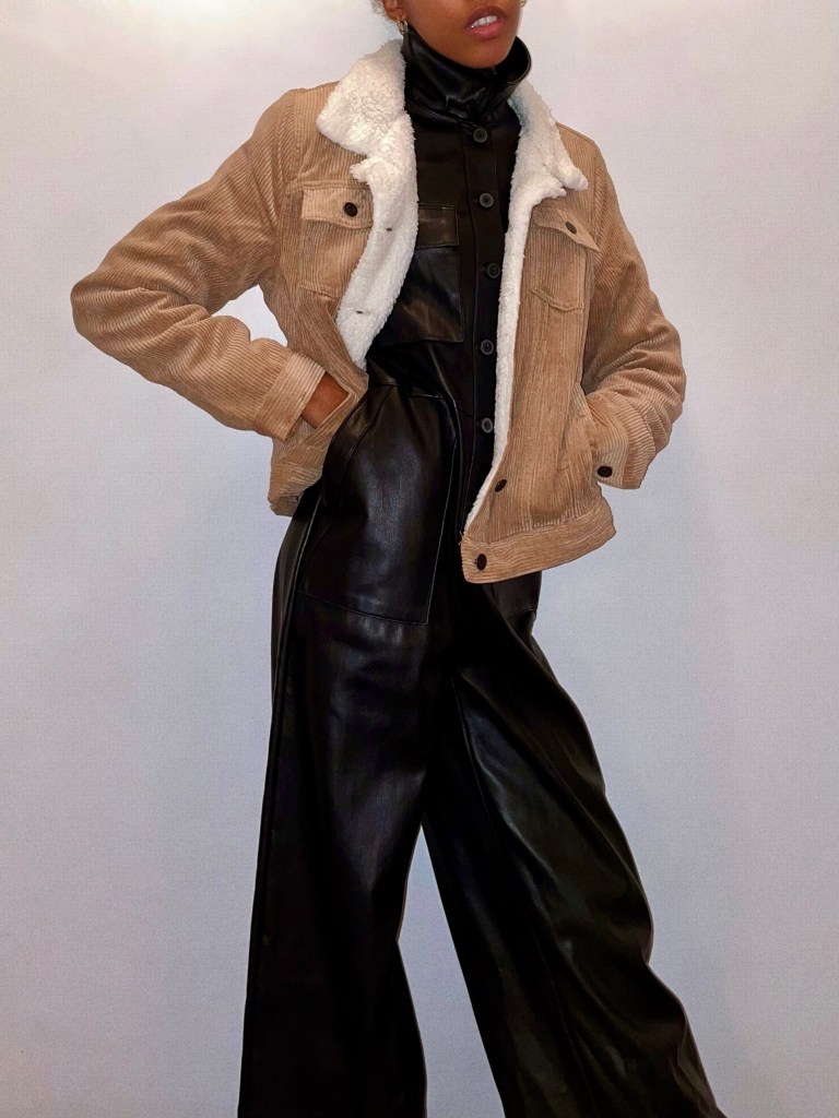 Typically when people think of wearing leather, the idea is to put on a leather jacket as outerwear for finishing touch to an outfit. Instead, I’m layering on top of the leather. My leather jumpsuit creates such a strong vertical line on the body. Adding the accent on the outside is such a different way to style the outfit.