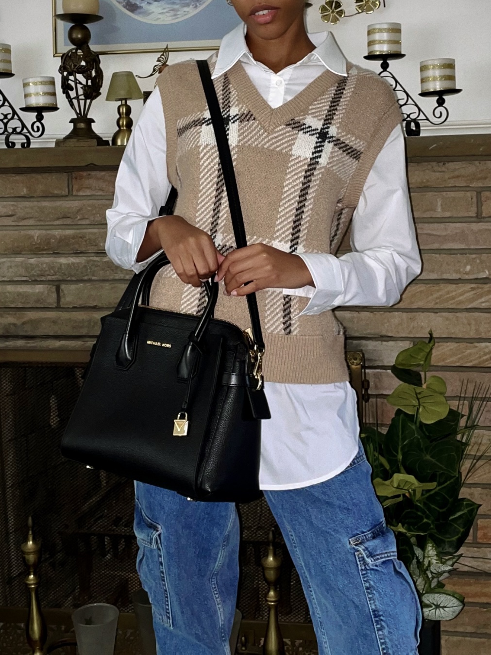 The white button-up under a sweater or sweater vest look is an absolute winner, in my opinion. I love combining a preppy top with bottoms that feel a little more street. To me, skater jeans are a perfect contrast.