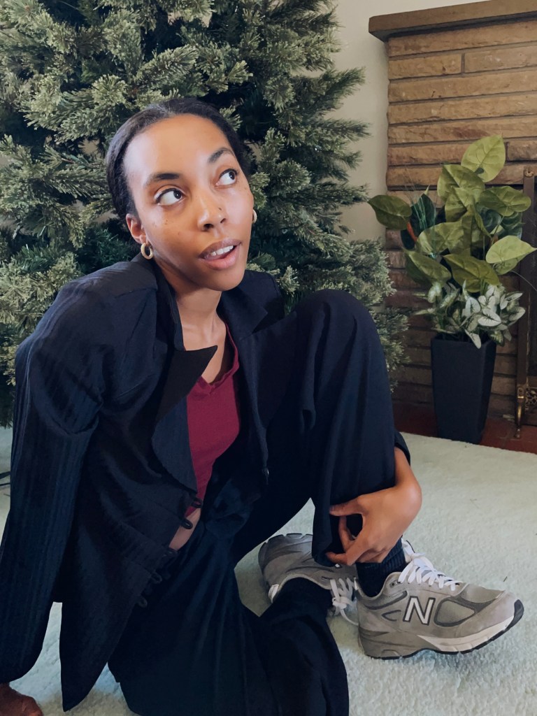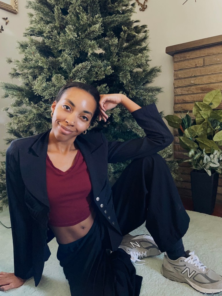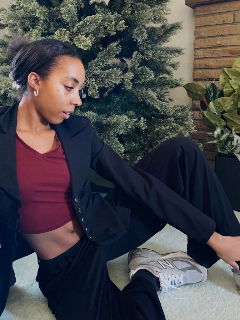 To me, it seems a little overrated to let the typical red or green dominate your outfit during the holidays. I like the idea of building a neutral base that dominates the outfit around a holiday color. From my wardrobe, I selected a black suit and grey New Balances with a red crop top.