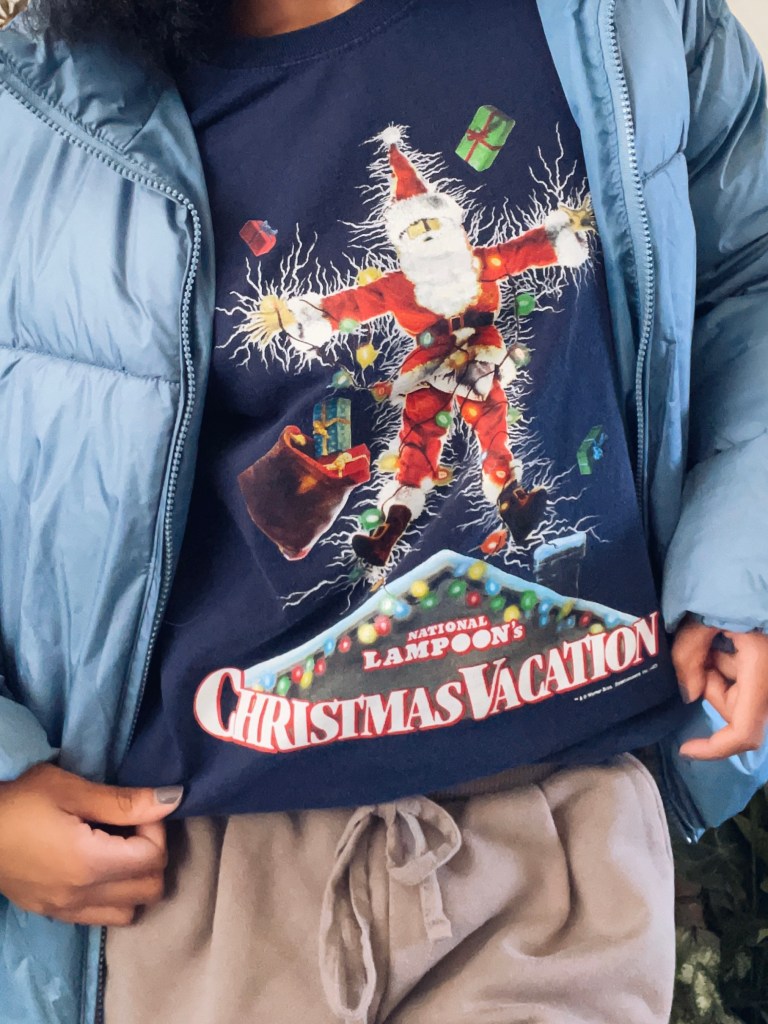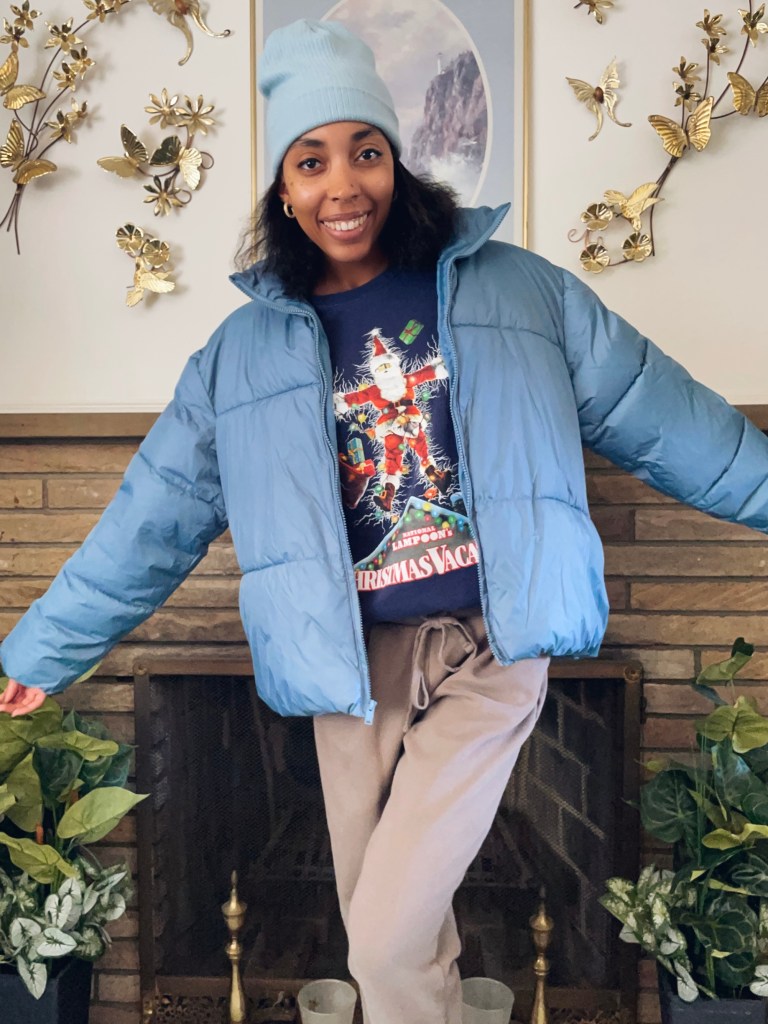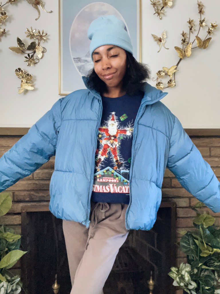 Now is the time to not only make your favorite Christmas movies a part of your personality, but also a part of your wardrobe. This is a perfect chance to make a comfortable everyday outfit. I added a beanie, puffer jacket, and sweats.
