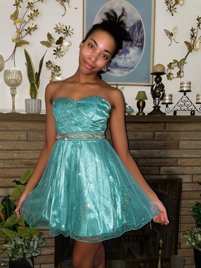 I wore this dress to my freshman year of high school homecoming. I feel like all of our first homecoming dresses looked somewhat like this. Just lost and confused. My real issue is with all of the different embellishments. The sparkly pearl belt with the sparkly fabric clashes so much it makes my head spin.