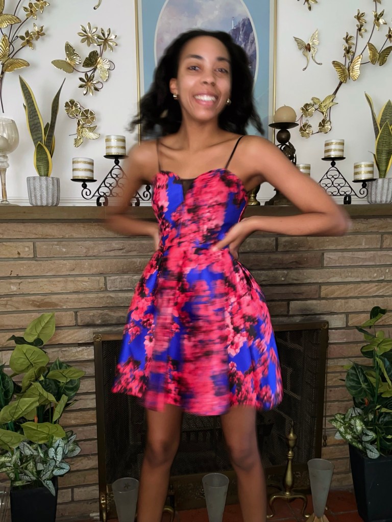 I got this dress in high school, but I never wore it to an event until I was in college. I have to admit I think the royal blue and pink look great together. Also, this dress fit me so well. My current self isn’t the biggest fan of floral print, but I don’t think this floral print is terrible. I never went for poofy dresses, so this short take on volume worked for me.