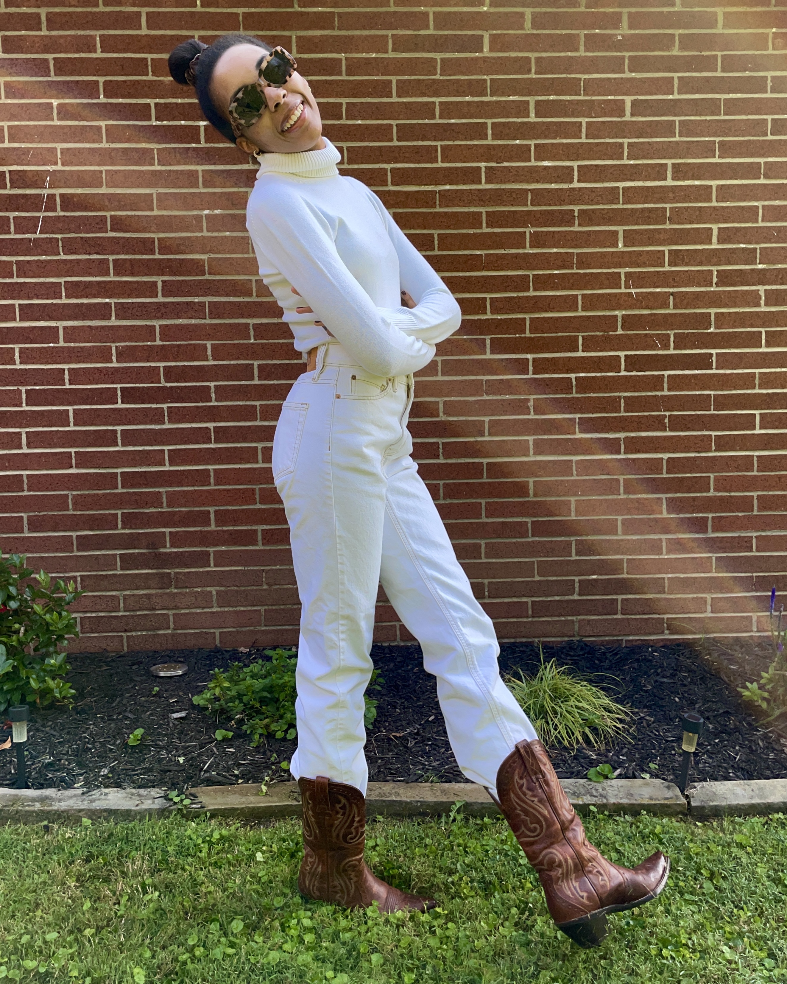 I love that instead of having an all-white outfit, the look is broken up by a muted pop of color with the boots. See more of my outfit in action below!