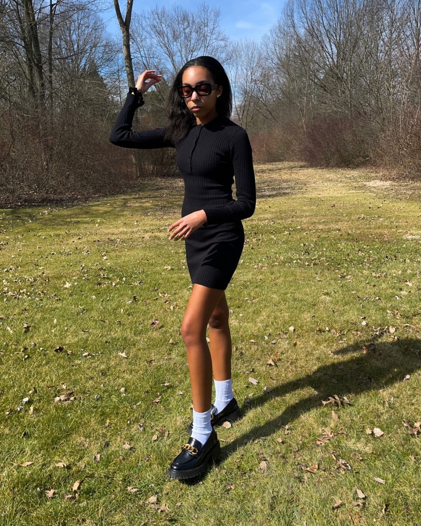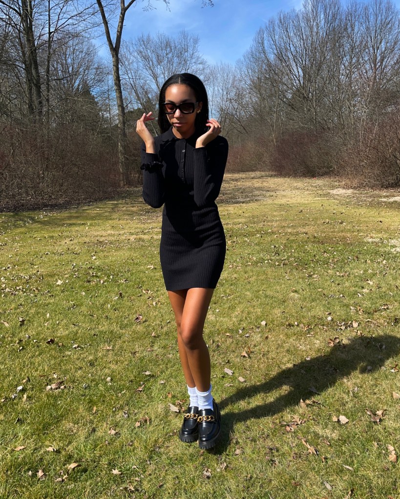 For spring, this long sleeve dress on its own is great for the transitional weather. Then, I added loafers and sunglasses. The last step is to pick a bag.