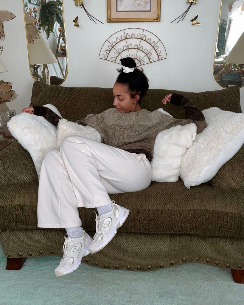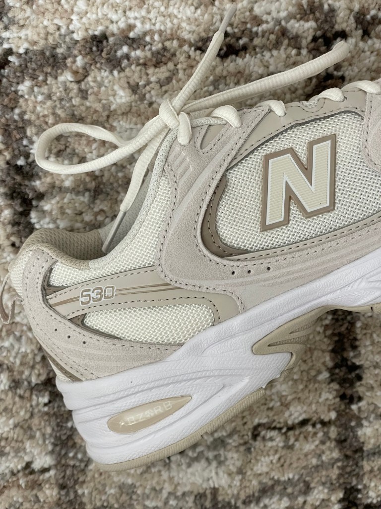 - sneakers (New Balance 530s in white/beige)