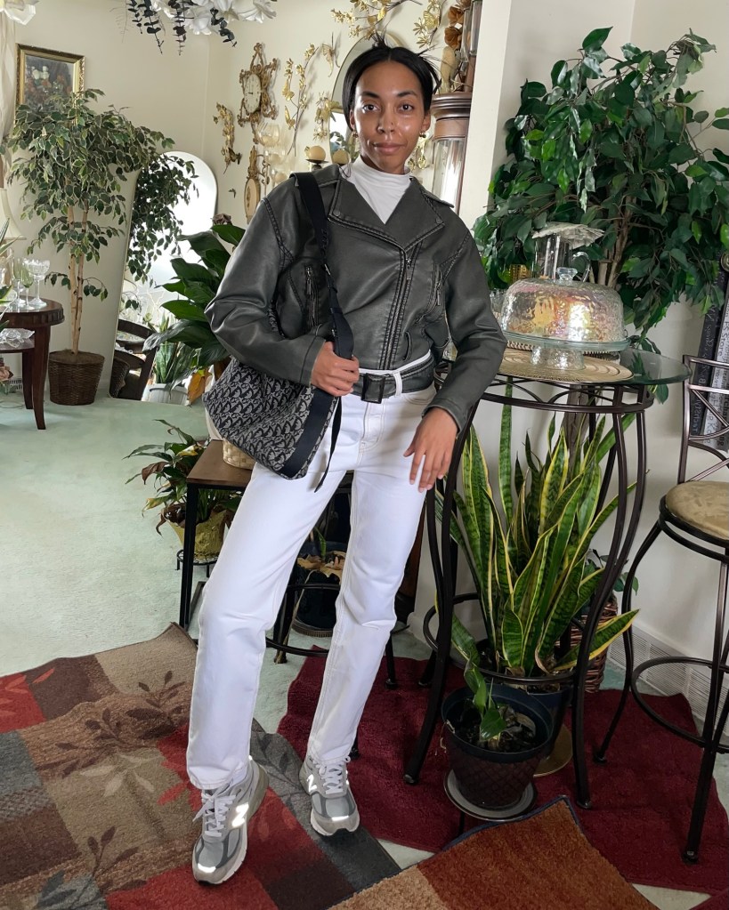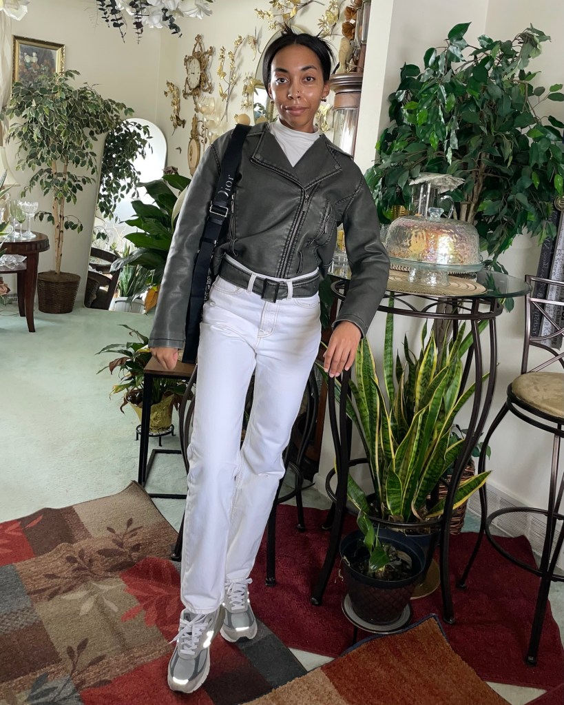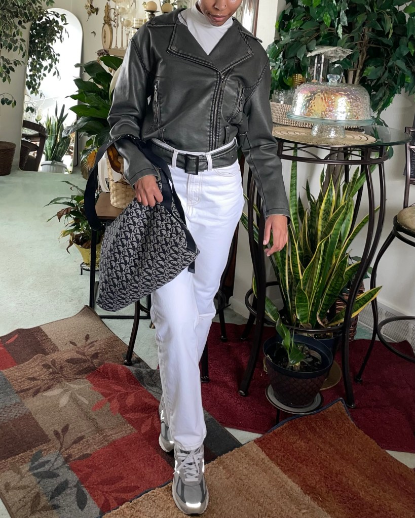 Today I’m styling my moto jacket for a winter outfit. Typically, I would just take off the belt to this jacket when it wear it. This time, I thought it would be a cute change to wear the belt with a pair of pants instead.
