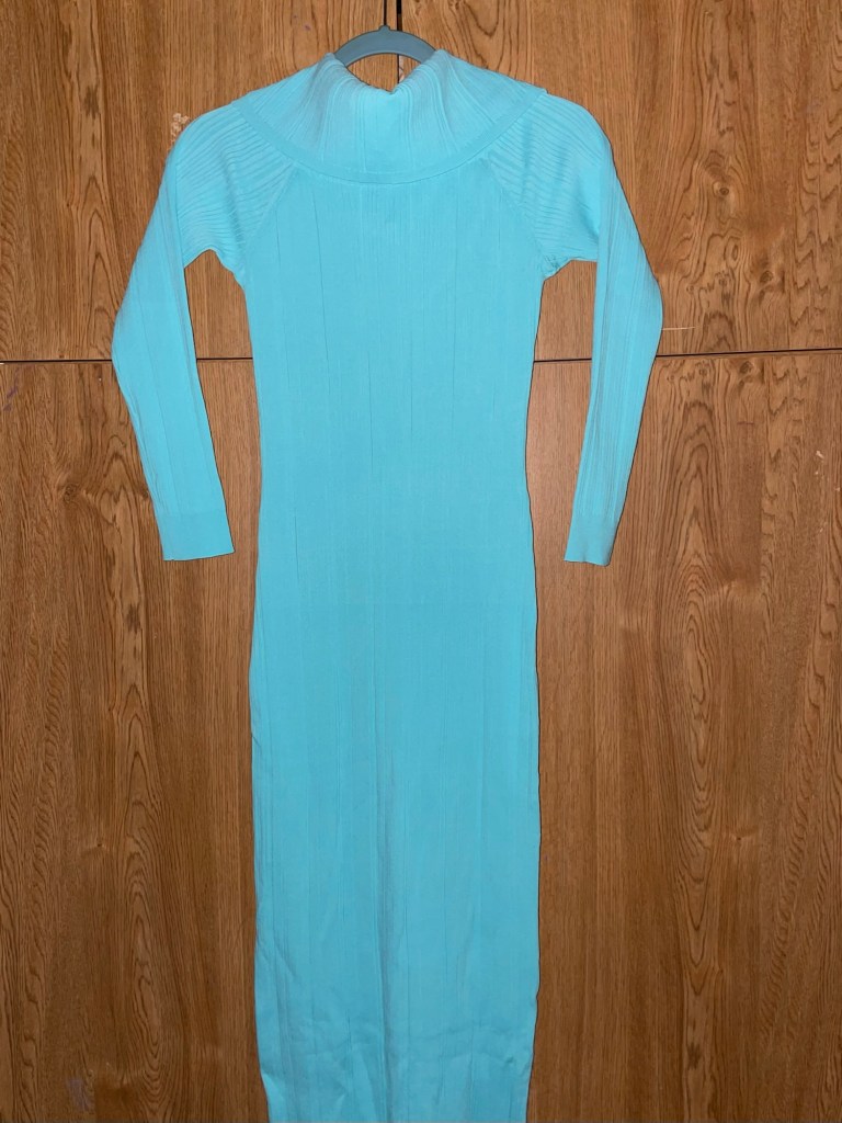- Off-Shoulder Sweater Dress in aqua reef (Bar III/Macy’s)