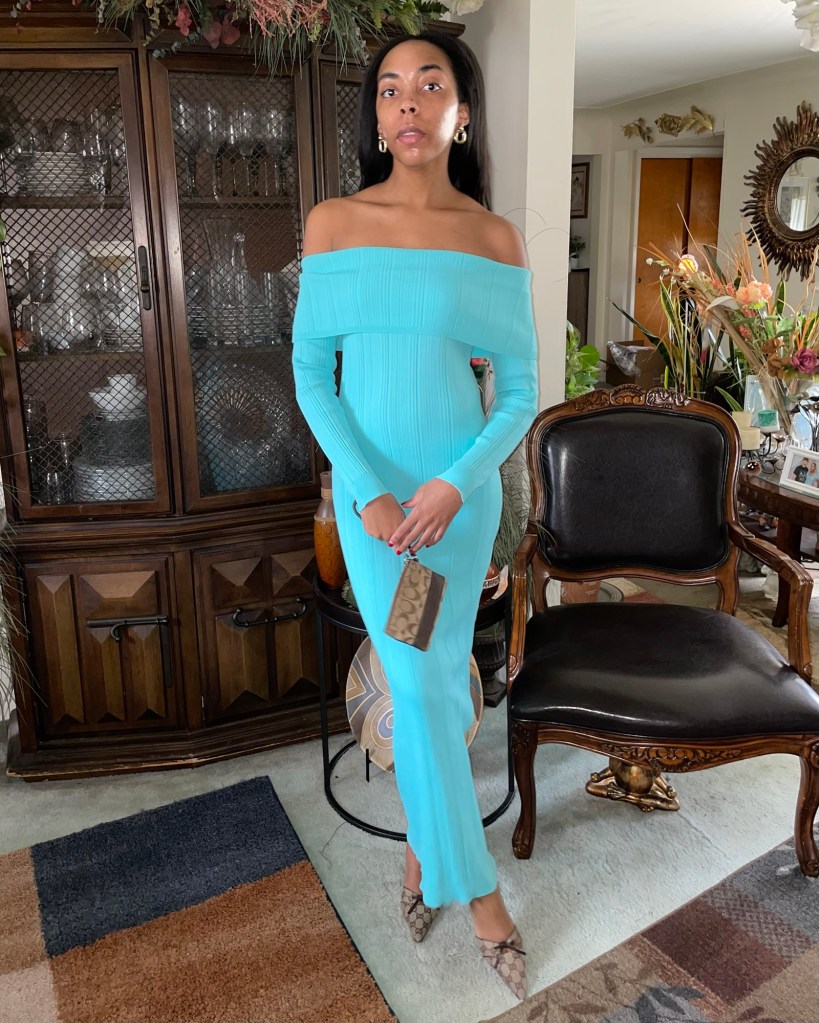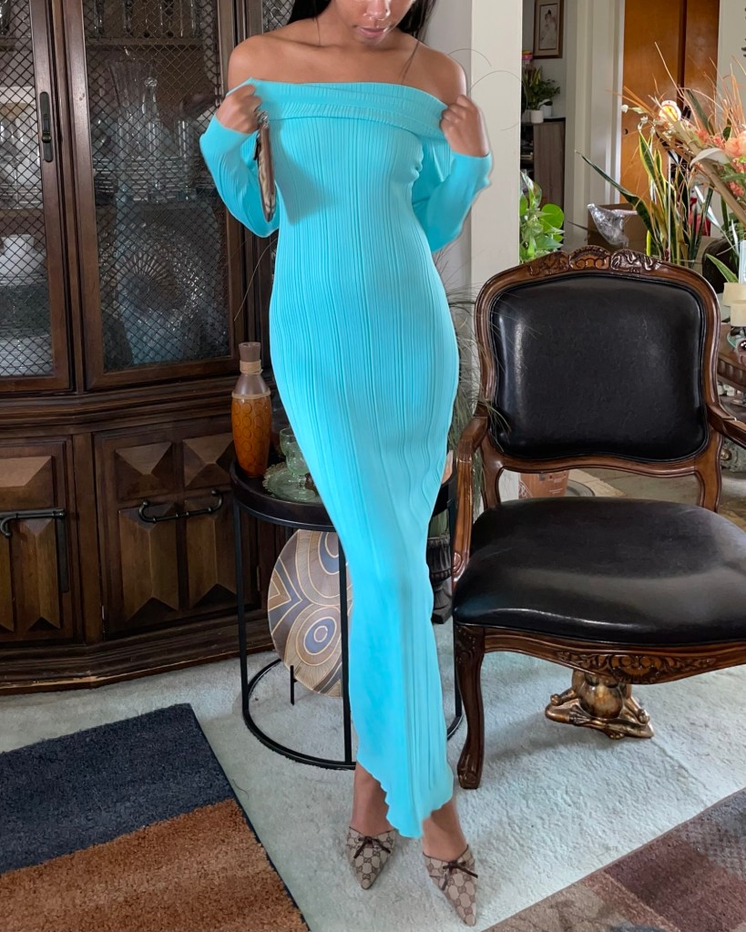 It’s a new month, and it’s time to start putting together some spring outfit inspo. I have just the right dress with the perfect coordinating perfume: Dylan Turquoise by Versace with an off-shoulder maxi dress.