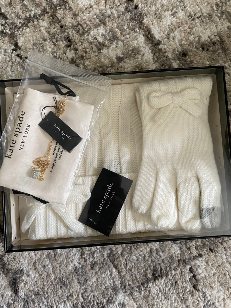 I wanted to put together an all-white holiday inspired out, The first item I started out with was my Kate Spade Women’s Metallic Bow Beanie & Gloves Boxed Set in the color French cream. Then I added a white blouse and white jeans. From there, I accessorized.